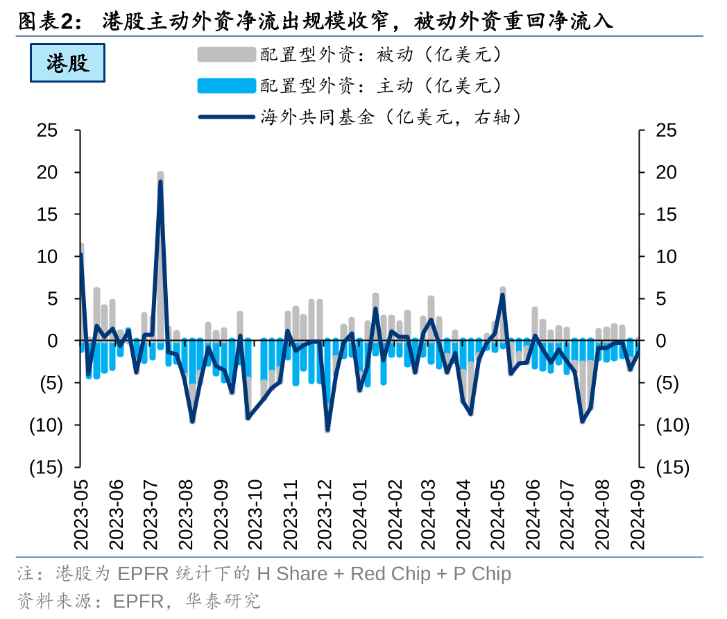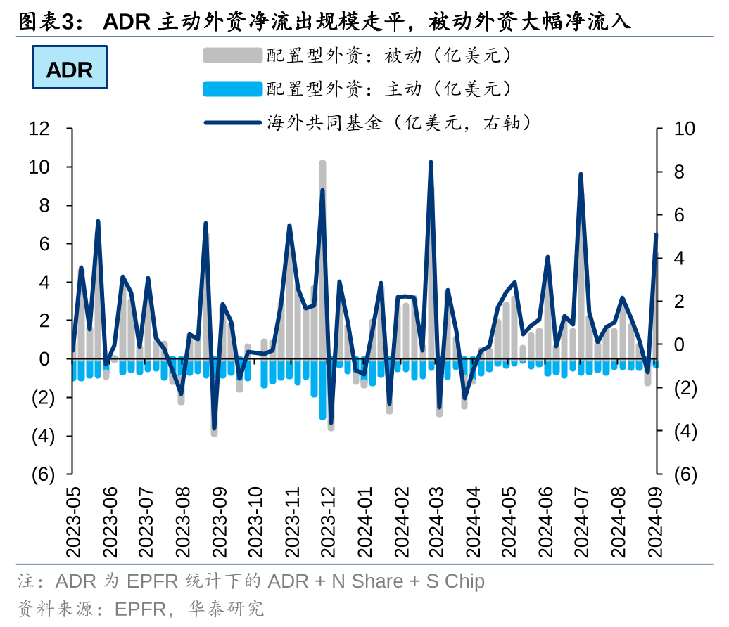 美联储降息周期开启或助力配置型外资改善。上周港股主动外资净流出规模收窄至1.42亿美元(vs前一周净流出2.15亿美元),被动外资转为净流入0.10亿美元(vs前一周净流入1.29亿美元);ADR主动外资净流出规模0.34亿美元,较前一周走平,被动外资大幅净流入5.42亿美元(vs前一周净流出0.95亿美元)。