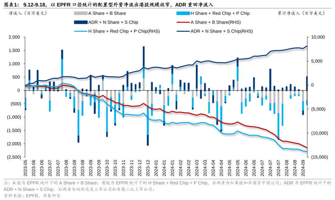 根据相关统计,在9月12日-18日期间,以EPFR口径统计的配置型外资净流出港股规模收窄,ADR重回净流入。其中ADR转为净流入5.08亿美元(vs前一周净流出1.29亿美元);港股净流出规模收窄至1.32亿美元(vs前一周净流出3.45亿美元)。