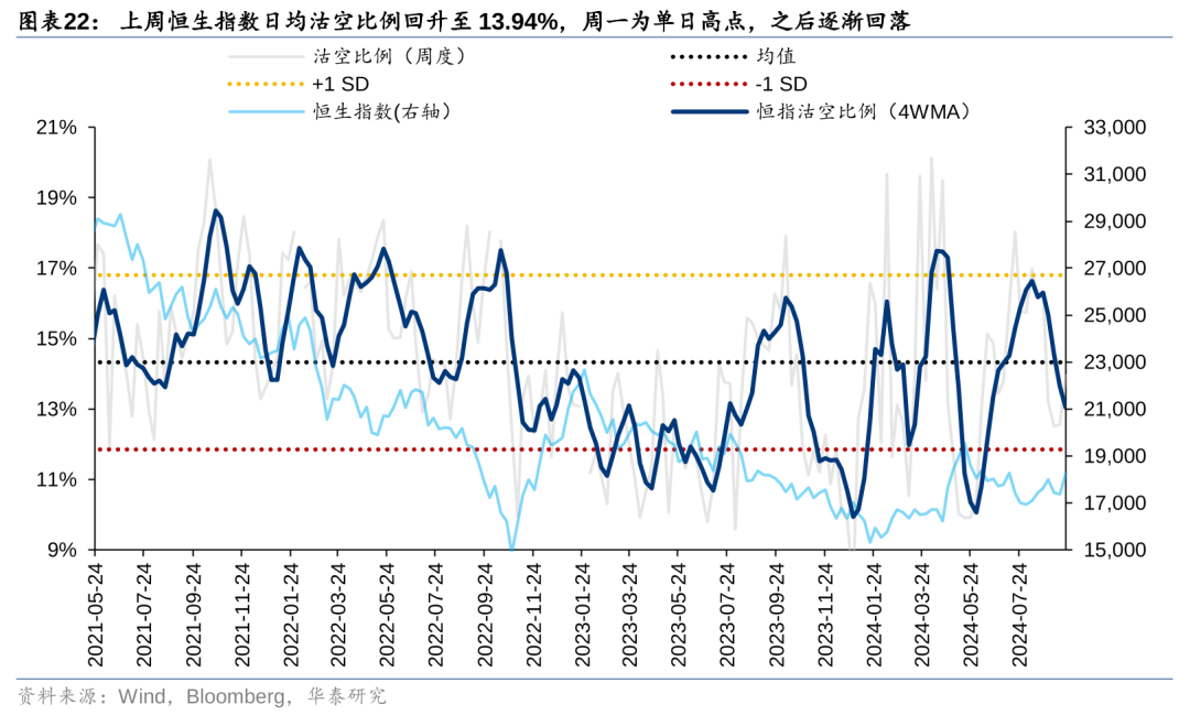 不过港股的空头头寸在上周有所回升。根据相关统计,恒生指数日均沽空比例回升至13.94%,周一为单日高点,之后逐渐回落至周五的11.25%。参考历史行情,若沽空比例低于10%则港股短期行情或有见顶风险,目前空头交易仍处于中性水位,或意味着当前仍为行情中继。其中,港股互联网沽空比例回升至13.0%,港股地产沽空比例回落至14.0%。