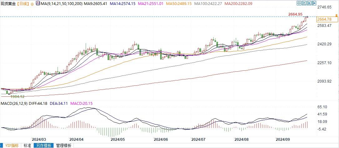 现货黄金日线图北京时间9月25日10:30,现货黄金报2664.70美元/盎司