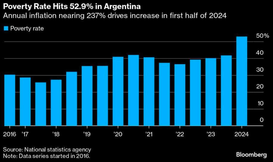财联社9月27日讯(编辑 潇湘)阿根廷国家统计局周四发布的官方数据显示,在米莱担任总统的前六个月时间里,阿根廷的贫困率从近42%跃升至了52.9%,这一数字的急剧上升反映了该国近期实施的一系列经济“休克疗法”所带来的痛苦。