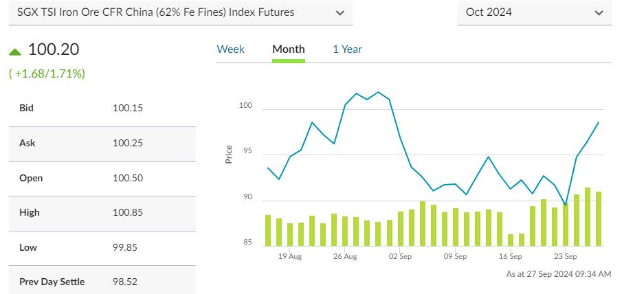 新加坡铁矿石期货价格周四一度升至每吨101.25美元,为9月2日以来的最高水平。