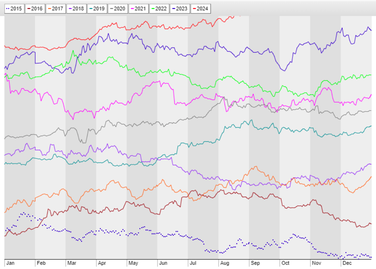 Umair提到,黄金市场呈走高趋势,并在2024年第三季显示出强劲的价格上涨。下面的季节性图表显示了过去十年的价格数据。可以发现,10月通常是价格高峰或盘整月份。图表显示,2023年和2015年是黄金市场在10月份经历大幅价格上涨的年份。