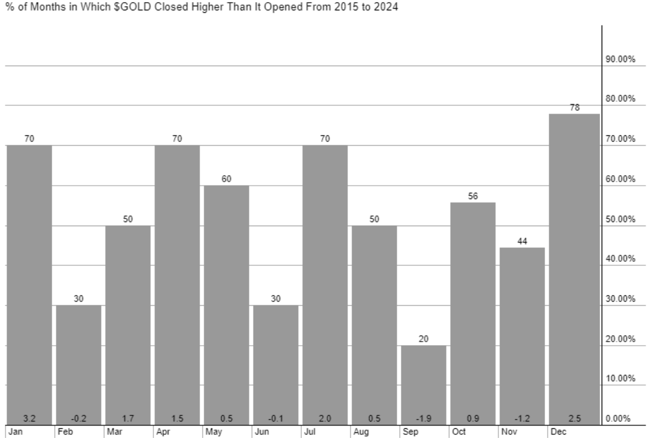 下图显示了过去十年中黄金收盘价高于开盘价的月份百分比。