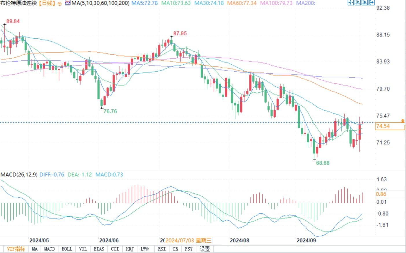 布伦特原油价格日线图北京时间10月2日11:11,布伦特原油价格报74.53美元/盎司