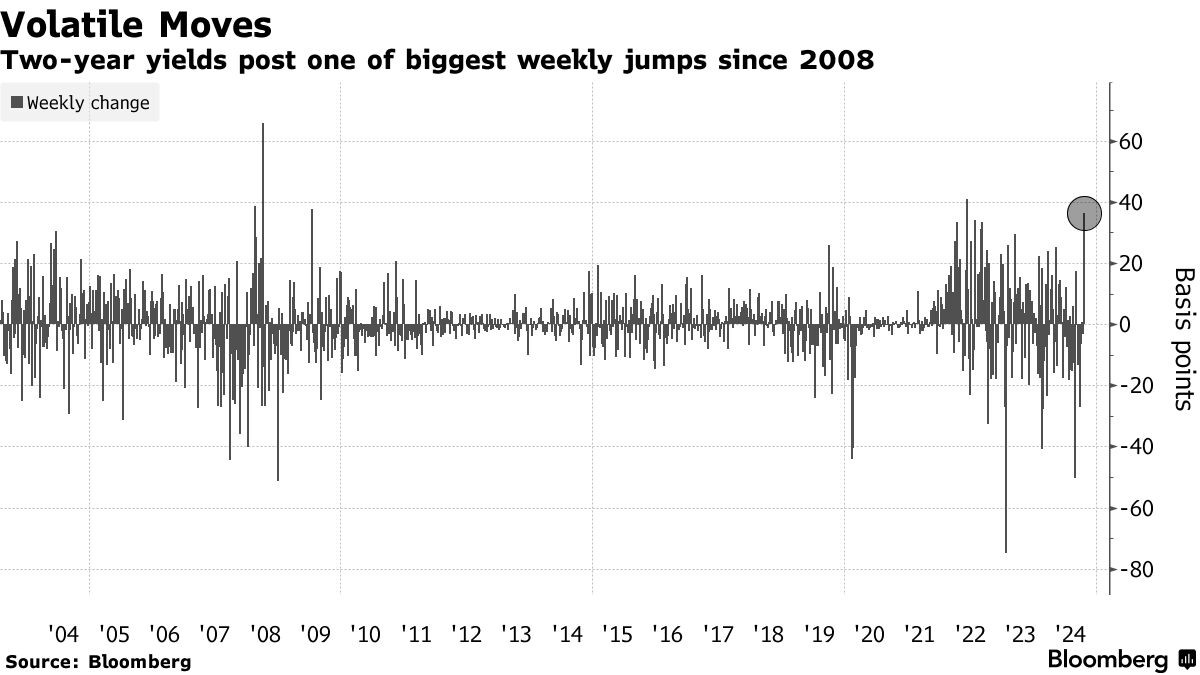 对于交易员来说,这是最新一次痛苦的调整,他们此前一直在为经济增长放缓、温和通胀和大幅降息做准备,大量买入对美联储利率政策敏感的短期美国国债。相反,上周五的报告重新引发了对经济过热的新一轮担忧,破坏了美债的涨势;相比之下,此前2年期美债收益率已跌至多年低点。