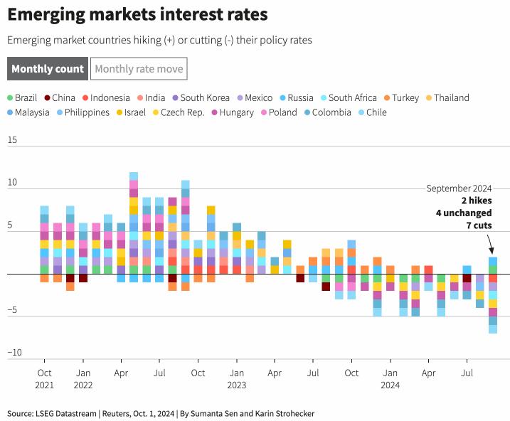 在媒体统计的18家相对主要的发展中经济体央行中,有13家在9月份召开了议息会议,其中七家降息、四家按兵不动、还有两家加息。