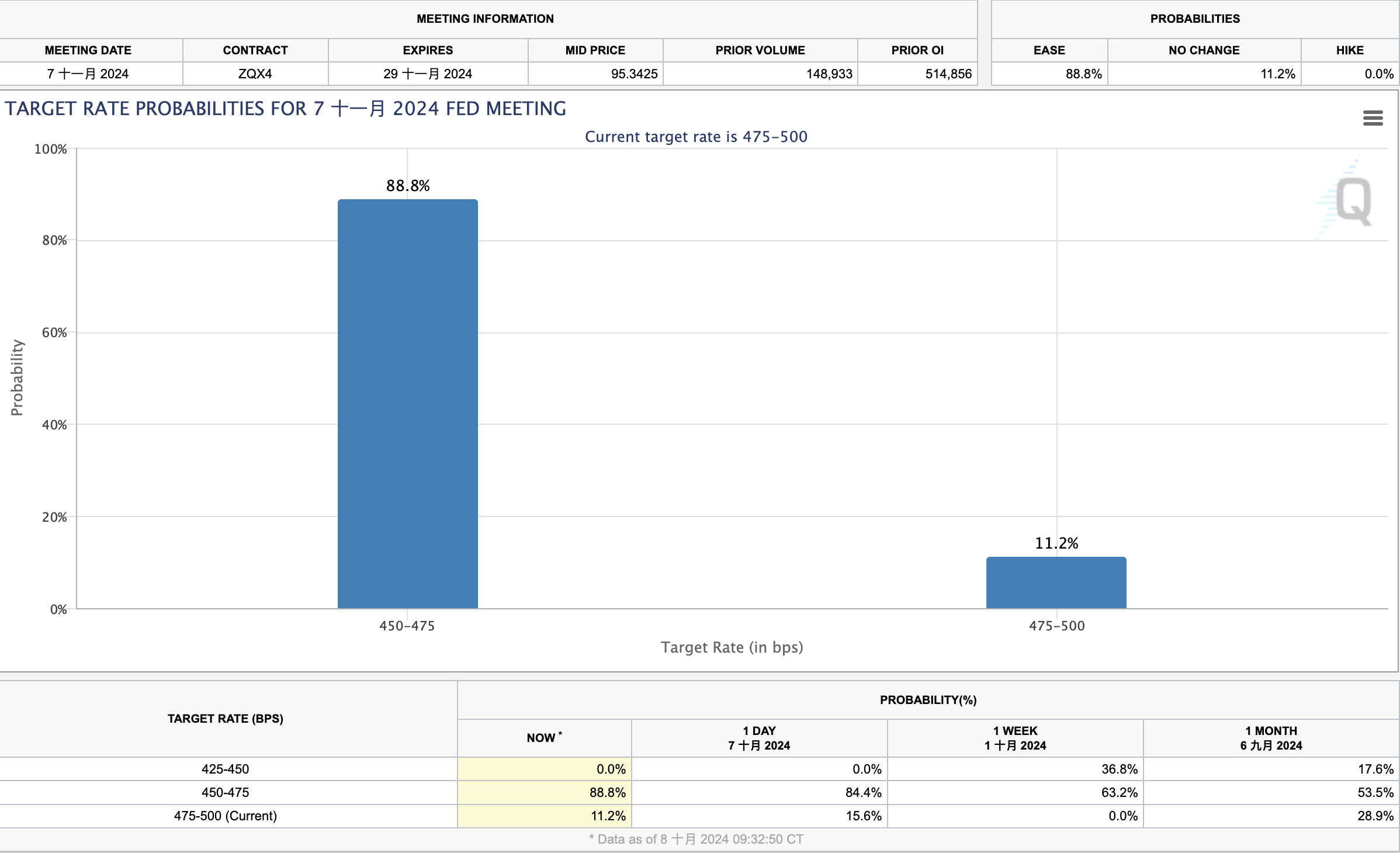根据芝商所(CME)美联储观察工具数据显示,交易员目前预计11月份降息25个基点的可能性约为88.8%,不降息的概率为11.2%,降息50个基点的可能性已降至零。