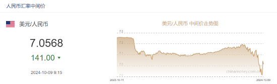 10月9日,人民币中间价报7.0568,上调141点,上一交易日中间价报7.0709。