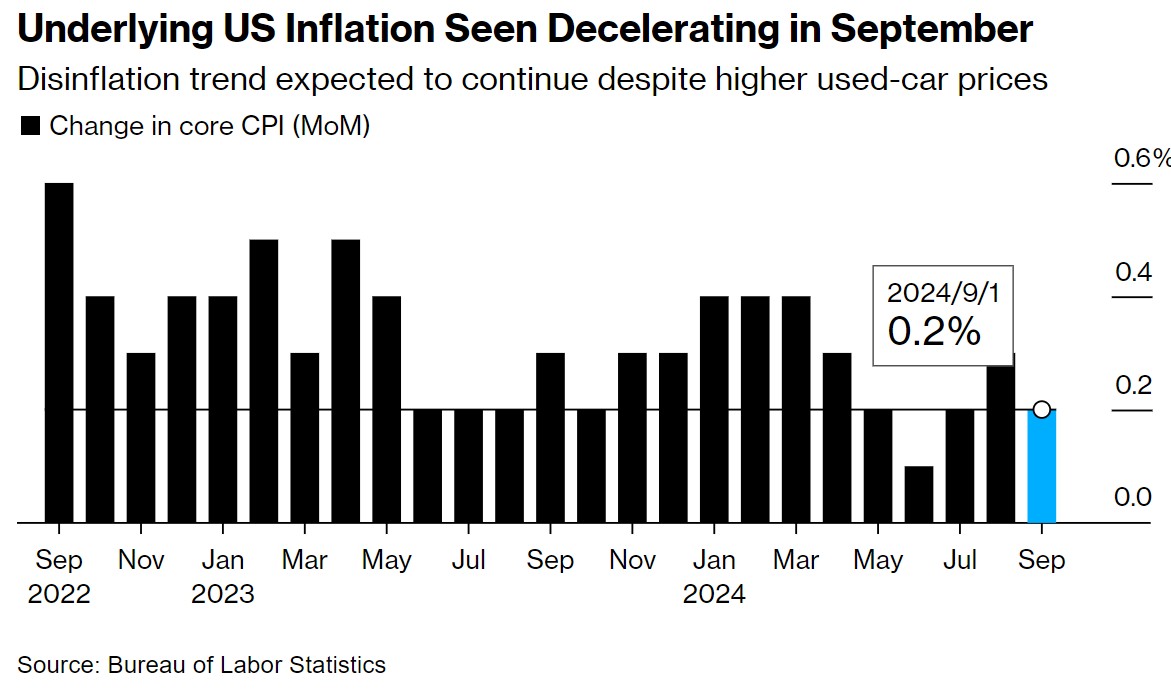 彭博经济首席美国经济学家Anna Wong周四在一份报告中写道: “即使核心 CPI 意外上涨,我们也不认为 9 月份的报告会改变 FOMC 对通胀呈下降趋势的看法。”她预计,继上个月联邦公开市场委员会 (FOMC) 降息半个百分点之后,11 月份的利率将再降 25 个基点。