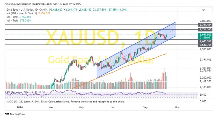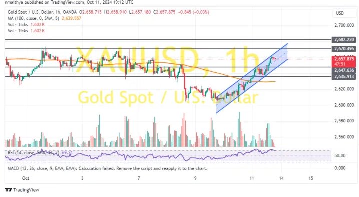 Kitonyi在文章中写道,上周五,在美国公布最新数据后,金价从约2635美元/盎司的关键支撑位反弹至约2657美元/盎司。在60分钟的图表中,金价在一个上升通道内交易。