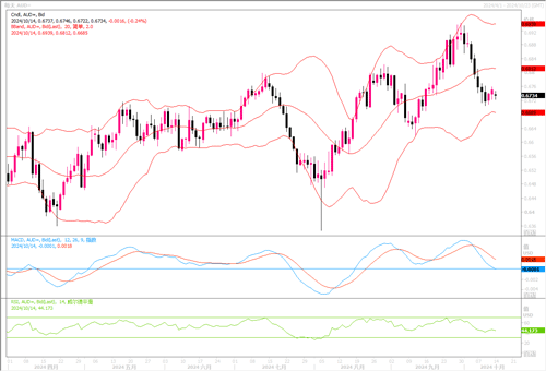 周五(10月11日),澳元兑美元从三周低点反弹,周五上涨0.22%,收盘报0.6750 美元。周五美国9月份PPI数据环比持平,巩固11月份将会继续降息的预期,从而给到澳元一定的刺激。此外,由于对中国财政部周末公布刺激经济细节有所期待,也提携澳元暂时维稳。日线图上,动能研究以及5日和10日移动均线下降,21日波林格区间温和收缩,仍显示有温和下行倾向。8月至9月升势的38.2%回档位0.6716短线提供了较为韧性的支撑,而一旦该支撑水平下破,澳元延续跌势的风险增高。目前澳元/美元上方主要阻力位在 0.6800,唯有突破该阻力位置,澳元/美元或才有望扭转颓势。