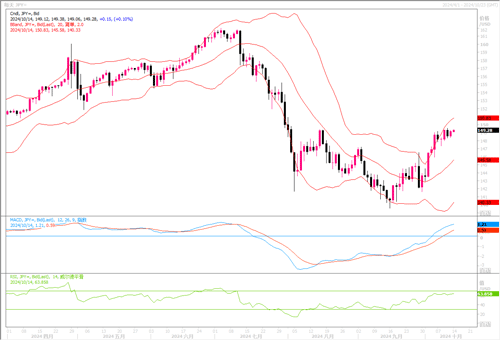 周五(10月11日),美元兑日元上涨0.35%,收盘报149.12。美国劳工部报告称,9月份消费者物价上涨0.3%,略高于预期,但环比持平。最新的经济数据表明美联储下个月可能会再次降息,然而降息的幅度更大可能是小幅度的。因此,美国收益率依然坚挺,日本公债与美债收益率仍保持较大利差则继续给到美元支撑。而且近期在147-150的区间内,日本进口商和出口商都有相应的实盘交易需求,令美元/日元呈区间震荡走势较为明显。日线图上,美元/日元已连续五日收于费波纳奇回档技术位148.13上方(148.13是161.96至139.58(7月至9月)跌幅的38.2%回撤位),14天动能保持积极,强化了美元看涨倾向。另一方面,若跌破本周低点147.35将是上行受阻的警讯