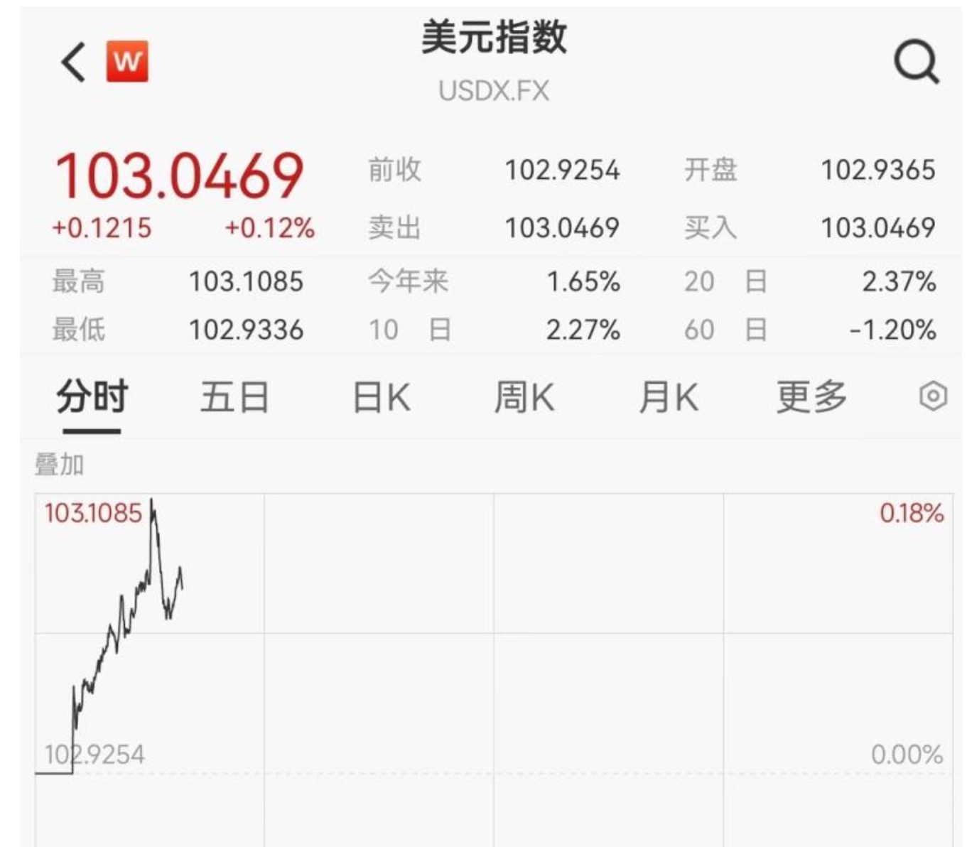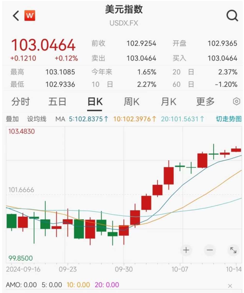 香港万得通讯社报道,10月14日上午,美元指数保持强势,拉抬170多个基点,涨势明显。此前,美元指数已经连续上涨两周,从阶段性低点100.1528上升至103上方。