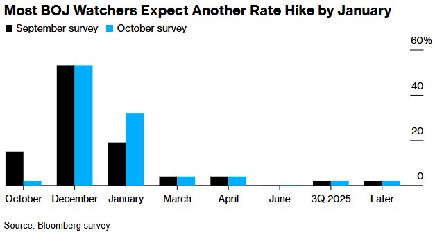在日本央行召开会议之前,执政的自民党在周日的选举中遭遇了15年来最糟糕的结果。执政联盟失去多数席位导致的政治不稳定可能让植田和男有更多理由观望,他已经表示希望关注美国大选结果及其对经济和金融市场的影响。