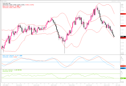 周二(10月29日),澳元兑美元继续下跌0.35%,收盘于0.6560,盘中触及0.6541美元,为8月中旬以来的最低水平。由于美国总统大选前美国收益率飙升,持续给到澳元压力。现在就看澳元能不能从周三将公布的第三季消费者通胀数据中获得提振。分析师预计,第三季度整体通胀率将降至2.9%,但以截尾均值衡量的核心消费者价格指数(CPI)可能较前季上升0.7%,较上年同期上升3.5%。若数据高于预期可能有望令澳联储延迟降息。澳洲联邦银行(CBA)的分析师已分析称,如果CPI截尾均值较前季升幅超过0.7%,他们将放弃对12月份降息的预期。CPI数据若表现强劲,则有助于澳元在交叉盘中保持一定的利差优势,从而或有望帮助澳元/美元缓解一些下行的压力。日线图上,澳元/美元继续沿着布林带通道下轨线下行,技术指标保持明显下顷态势,显示澳元的弱势明显。目前下方0.6520-0.6500区域的支撑较为关键,若能守稳上述区域,或许短期有反弹整理之机。若跌穿,下行幅度将进一步延伸。