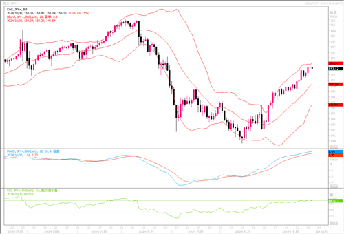 周二(10月29日),美元兑日元收盘报153.47,当日上涨0.12%。美元在周二的外汇市场上走势分化,欧洲货币兑美元略有上升,而亚太货币兑美元则仍维持着疲软。目前交易商在下周美国大选和一系列经济数据出台前等待时机。而日元则因为日本执政联盟在周末的选举中失去了议会多数席位,使政治和货币形势变得扑朔迷离,并一直对日元构成压力。日本央行将于周四公布货币政策决定,市场普遍预计其将维持利率不变,因此对于日元也起不到支持的作用。从日线图来看,美元/日元周二突破了153.41技术位(153.41是161.96-139.58(7月-9月)EBS跌幅的61.8%回撤位所在),且收于其上方,显示美元/日元多头仍尝试冲高。当前周五的151.45低点和位于151.47的200日均线应共同限制着美元的跌势。如果跌破这些支撑位并收盘于其下方,则美元有望转空。短期还需防范日本央行周四有意外之举所带来的变化风险。