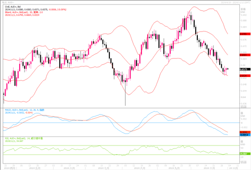 周四(10月31日),澳元兑美元变动不大,收盘在0.6572 美元。在澳洲,鉴于第三季度通胀报告显示核心通胀保持稳定,投资者进一步缩减了对澳洲央行宽松政策的预期。尽管大多数经济学家仍预计澳洲央行将在明年2月有所行动,但市场定价显示首次宽松的可能性要到明年5月份才达到100%。这也是为什么澳洲三年期公债收益率上升6个基点至4.033%的7月以来最高的部分原因。十年期公债收益率上升4个基点至4.518%,为5月份以来最高,并突破了4.512%的关键水平。本月,三年期收益率上升了46个基点,十年期收益率上升了52个基点。息差因素暂时或许能令澳元获得喘息之机。目前关键还要看日内美国非农数据情况。若美国就业市场继续显示松动,澳元或能从近期的3个月以来的低位0.6532水平附近展开反弹。