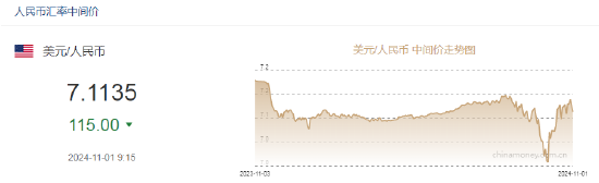 11月1日,人民币中间价报7.1135,上调115点,上一交易日中间价报7.1250。