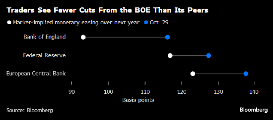 在预算案发布之前,低于目标的通胀率以及服务业价格放缓,已经提高了英国央行可能在11月和12月连续降息的可能性。贝利此前的讲话也助长了外界猜测,他表示如果有关通胀的好消息继续传出,那么央行可能会略微更加激进。