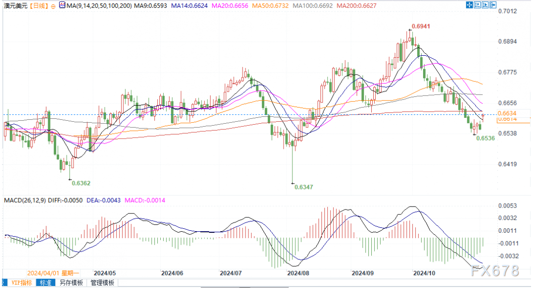 澳元兑美元日线图北京时间11月4日11:33,澳元兑美元报0.6613/14