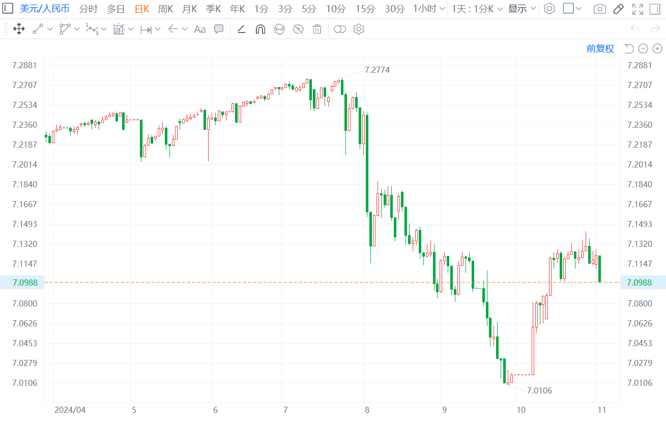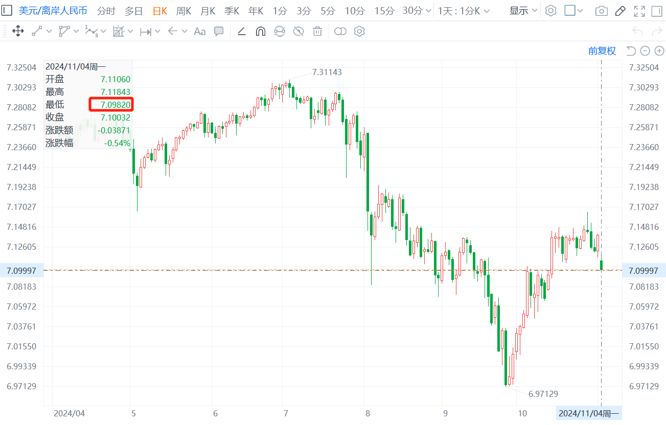 格隆汇11月4日|离岸人民币兑美元升穿7.10关口,为10月15日以来首次,日内涨近400点。在岸人民币兑美元日内涨近300点,目前报7.0988。
