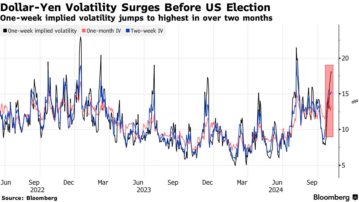 美国大选的投票结果将持续加剧日本市场的波动,日本执政联盟在下议院选举中失去多数席位,导致国内资产价格大幅波动。美元兑日元一周隐含波动率已升至8月初以来的最高水平,当时日本央行的意外加息曾经导致日元大幅上涨。