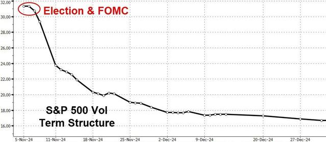 由于大选和美联储的影响渗透到短期指标的计算中,标普500指数的短期隐含波动率相对于一个月的水平一直很高。衡量VIX波动率的Cboe VVIX指数近期也有所上升。