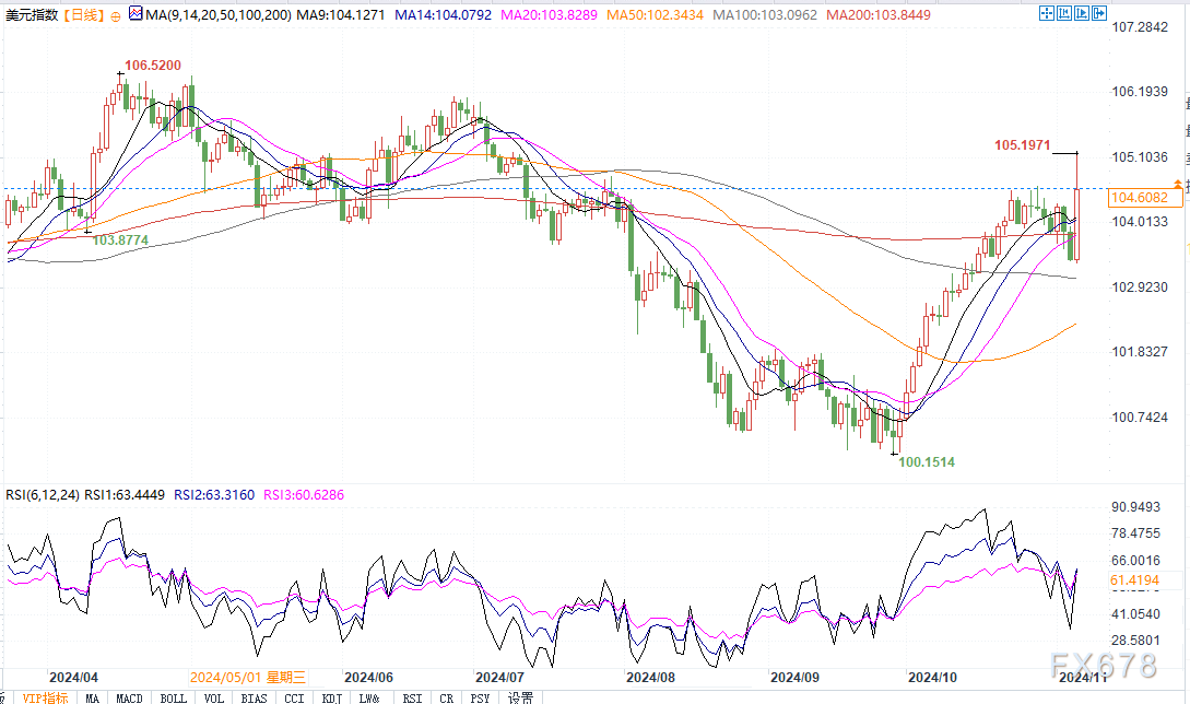 美元指数日线图北京时间11月6日13:24,美元指数报104.71