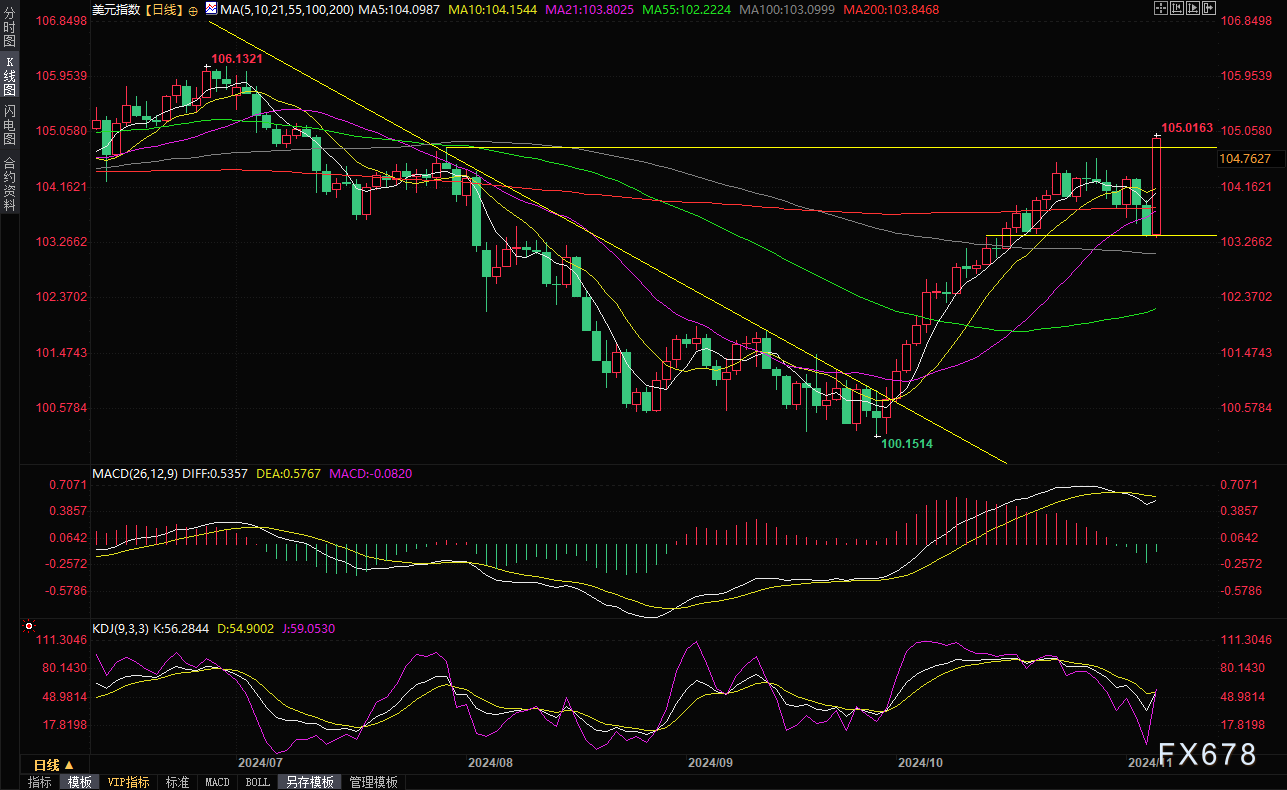 美元指数周三(11月6日)全线劲升,一度创7月10日以来新高至105.02,涨幅约1.55%,有望录得2022年9月以来最大单日涨幅,随着美国总统大选的初步结果逐步揭晓,投资者重返 “特朗普交易”。