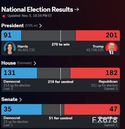 截止11:34,特朗普已经获得201张选票,哈里斯获得91张选票;候选人需要在各州选举人团中获得总计270票才能当选总统。