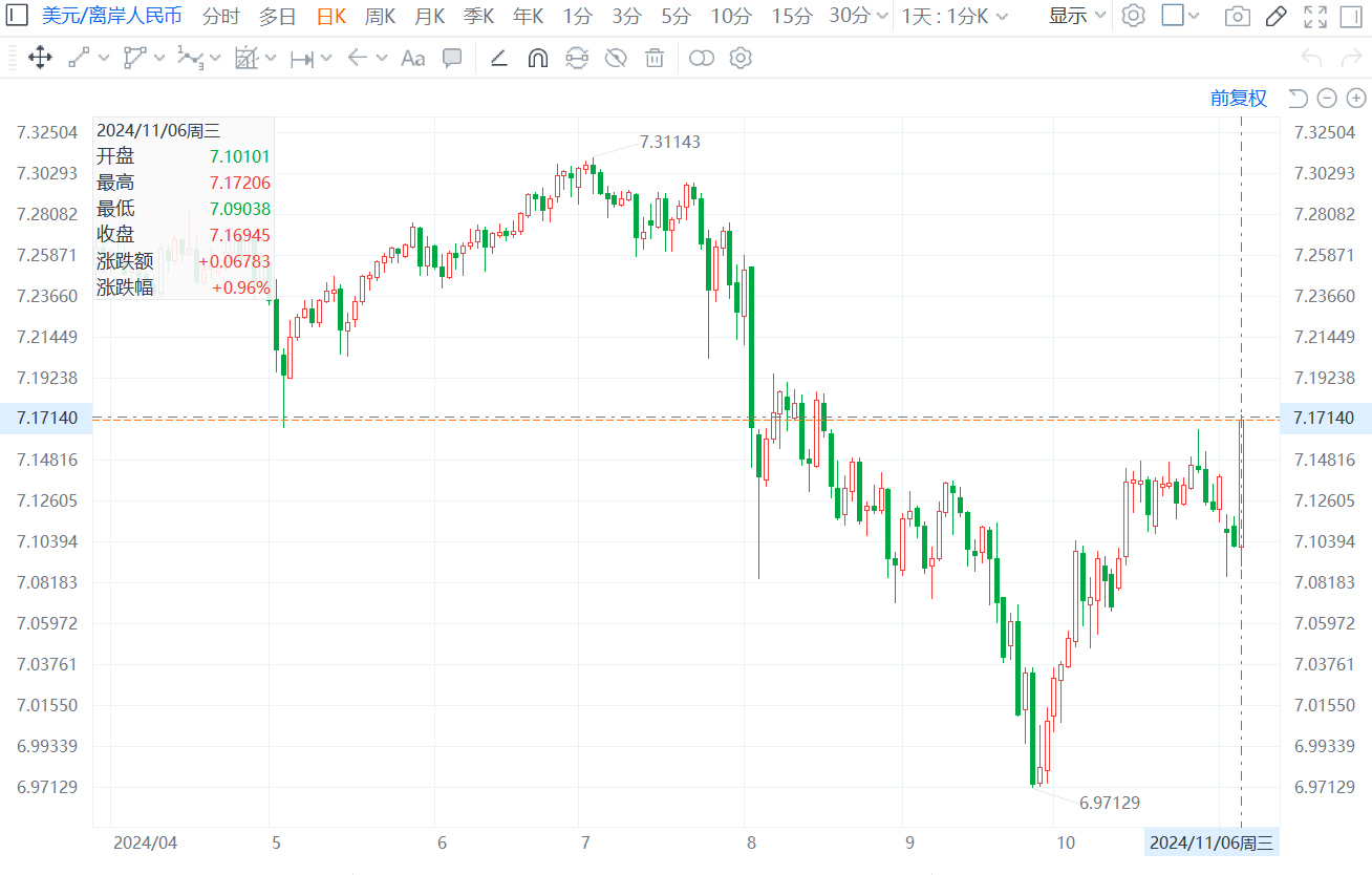 格隆汇11月6日|离岸人民币兑美元下破7.17关口,日内跌超700点。