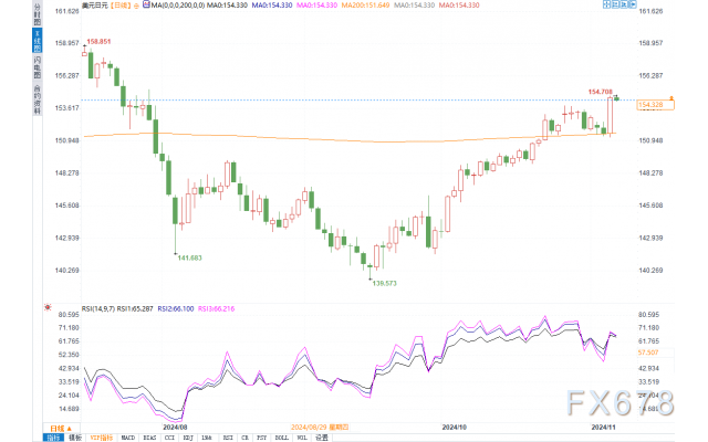 美元兑日元日线图北京时间11月7日11:58,美元兑日元报154.324/38。