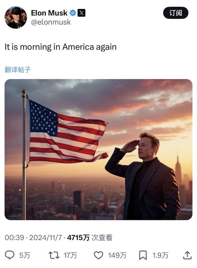 马斯克6日在X发帖说“美国又迎来了早晨”,并发布一张疑似由AI生成的、内容为他面向美国国旗敬礼的图片。
