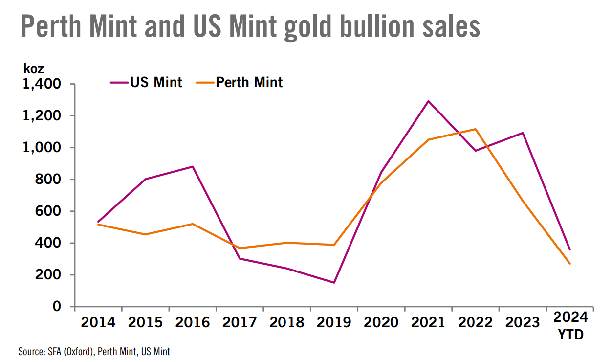 分析师认为,这一切都代表了两个铸币局零售购买量的持续同比下滑,符合全球更大的趋势。截至2024年第三季度,金条和金币的投资同比下降了9%。不过,美国和澳大利亚珀斯铸币局的下降,被亚洲增长的购买量所抵消。即便亚洲的购买有强劲增长,零售投资需求仍然低迷,如果金价保持高位,可能会继续承压。