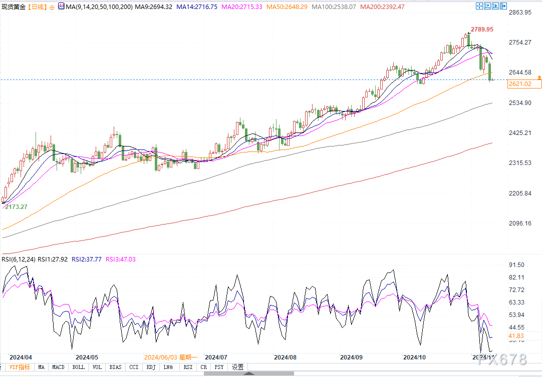 分析师们写道:金价跌至19天来的最低水平,而随着特朗普重返总统之位的前景愈发明朗,美元也走强。美元指数在特朗普胜选当天,对多数主要货币的汇率上涨超过1%。在2016年特朗普首次胜选后,黄金价格曾下跌11.6%。