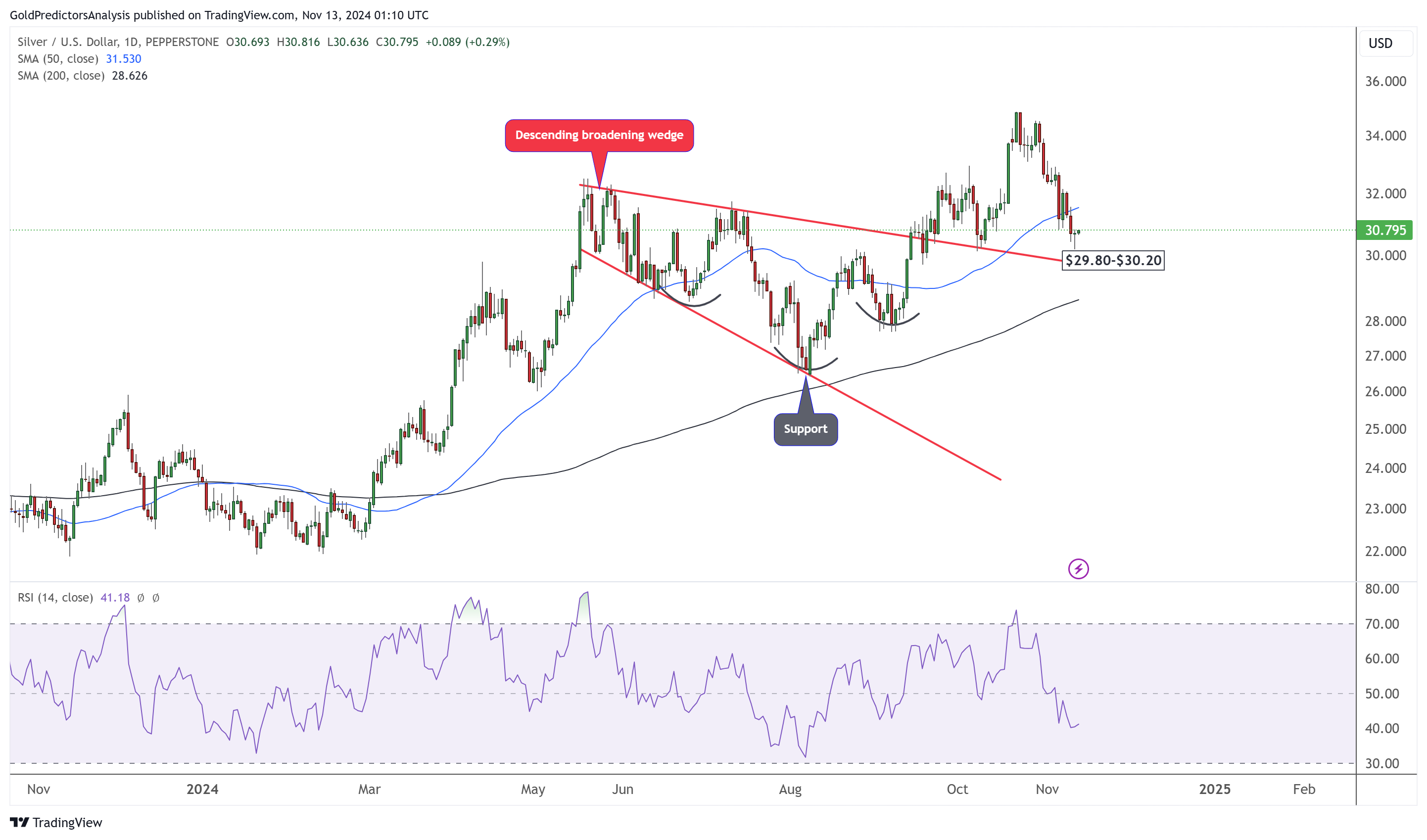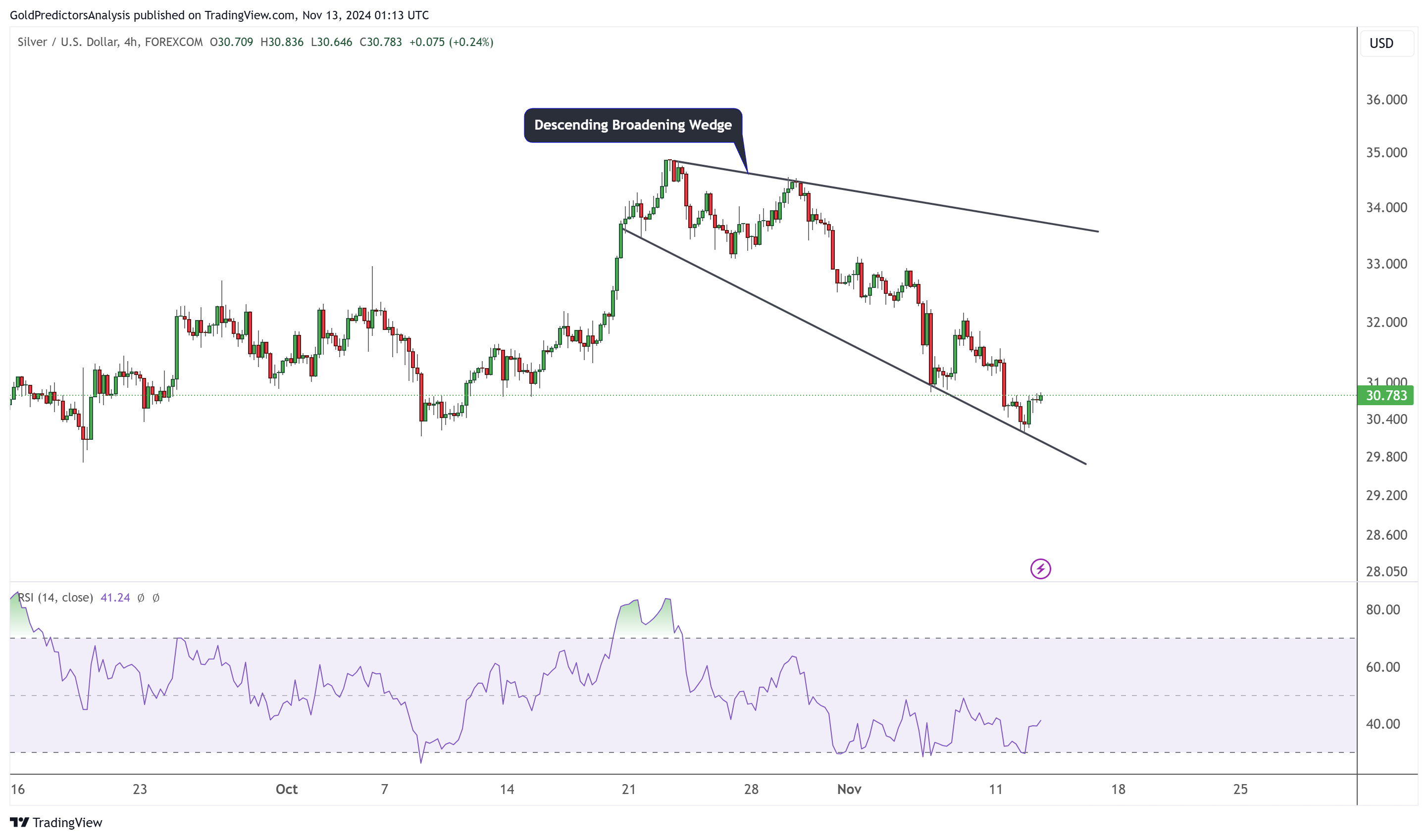 现货白银价格回调已形成下行扩展楔形形态。4小时图确认日线支撑位在30.20美元,下行扩展楔形下线延伸至该位置。超卖RSI在中线下方盘整,表明在进一步走高之前将进一步盘整。