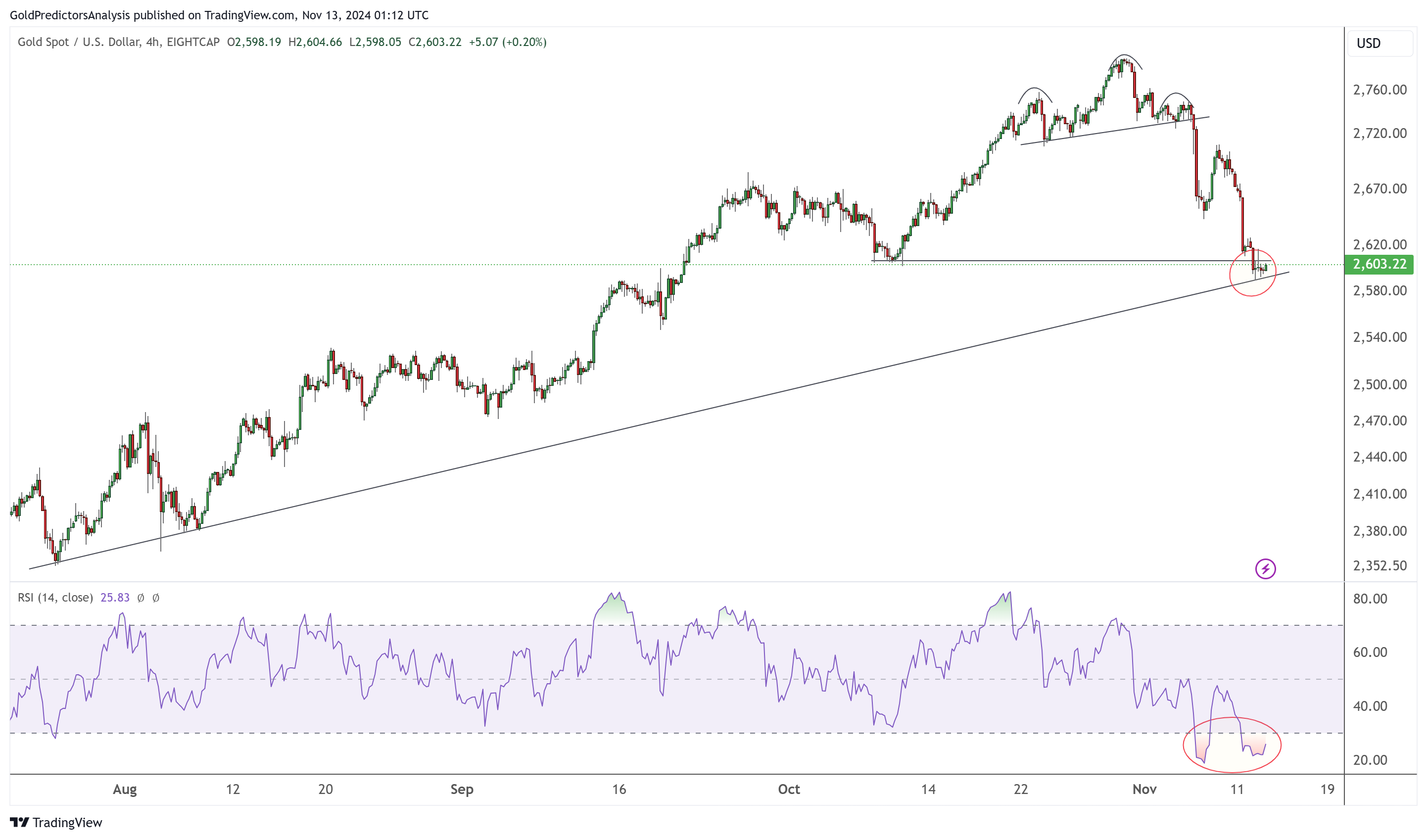 黄金4小时图显示,在2790美元形成倒头肩形态后,价格开始回调。目前价格正在接近黑色趋势线的支撑位。RSI接近超卖状态,表明短期可能出现反弹。