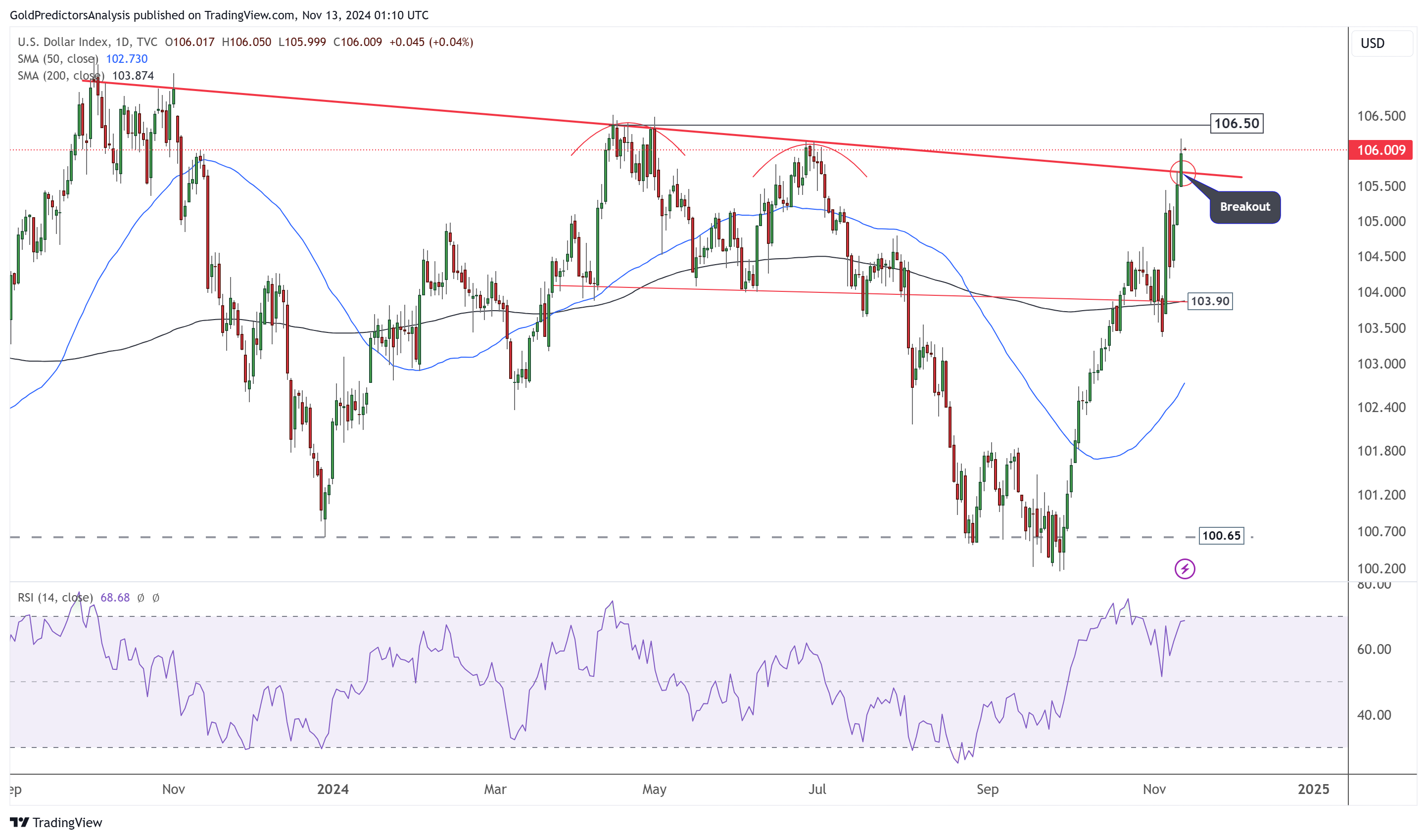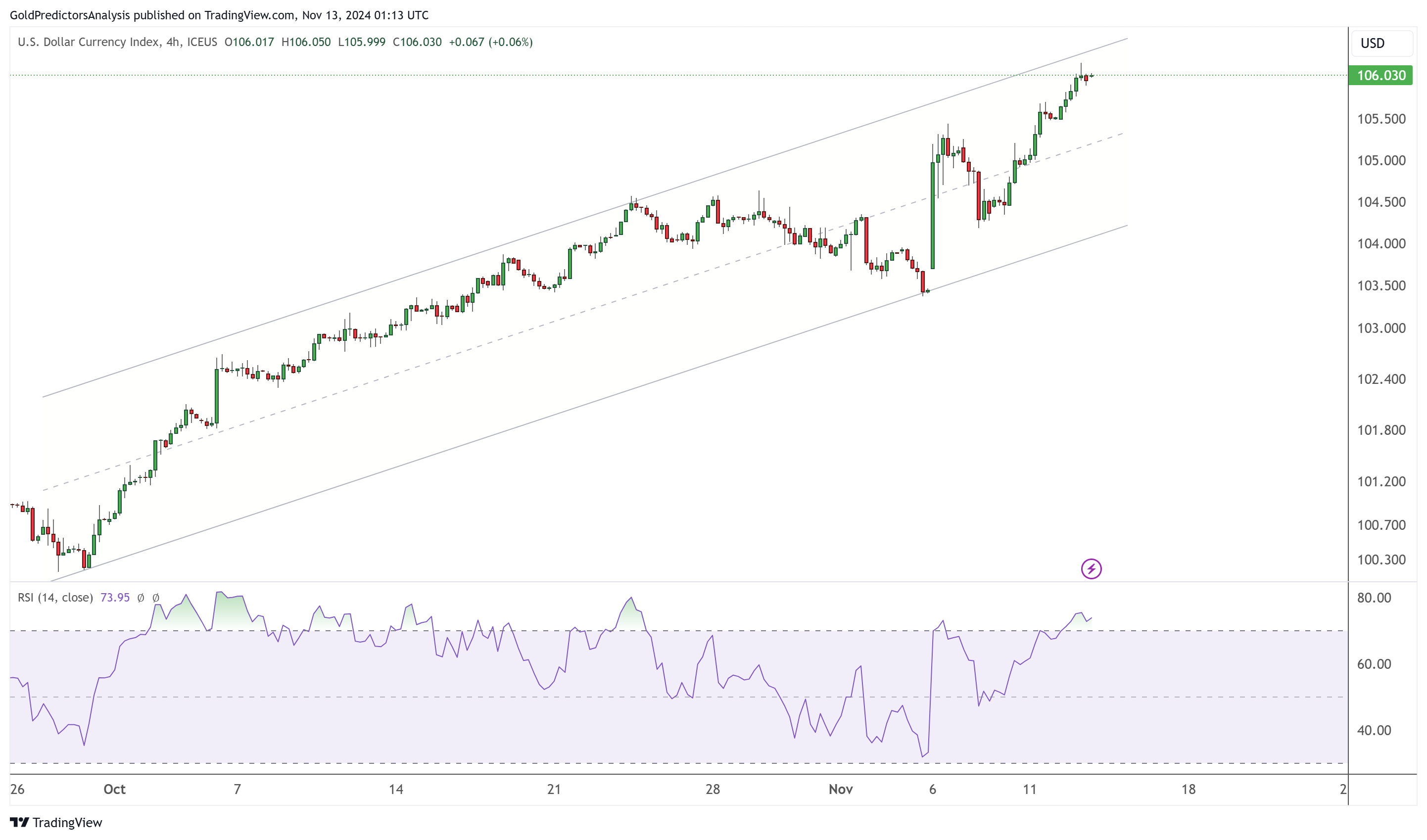 FX168财经报社(亚太)讯 周三(11月13日),美元指数冲破106,黄金价格在2606美元疲软震荡。“特朗普交易”(Trump Trade)持续发酵,强美元压制了黄金和贵金属买盘。但市场分析认为,美国消费者物价指数(CPI)的通胀数据可能冲击市场,转而提振金价。