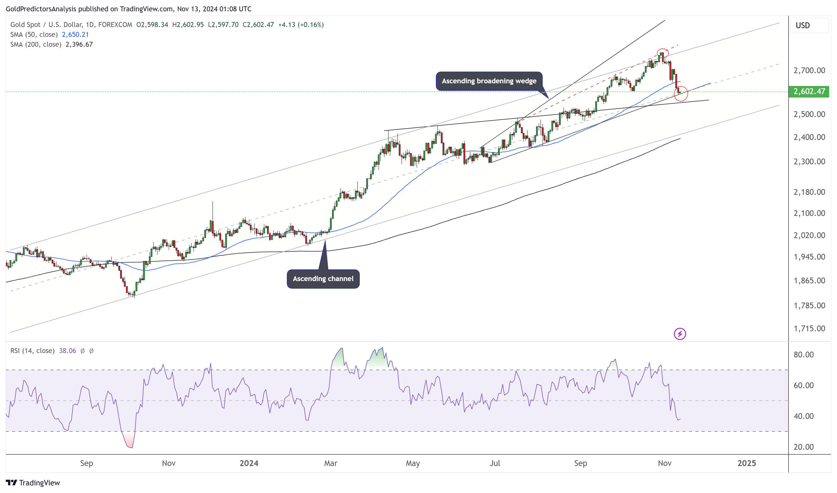 黄金日线图显示,价格回调始于红点趋势线的强阻力位2790美元。目前价格正在测试上升扩展楔形的支撑位和上升通道中线2595美元。