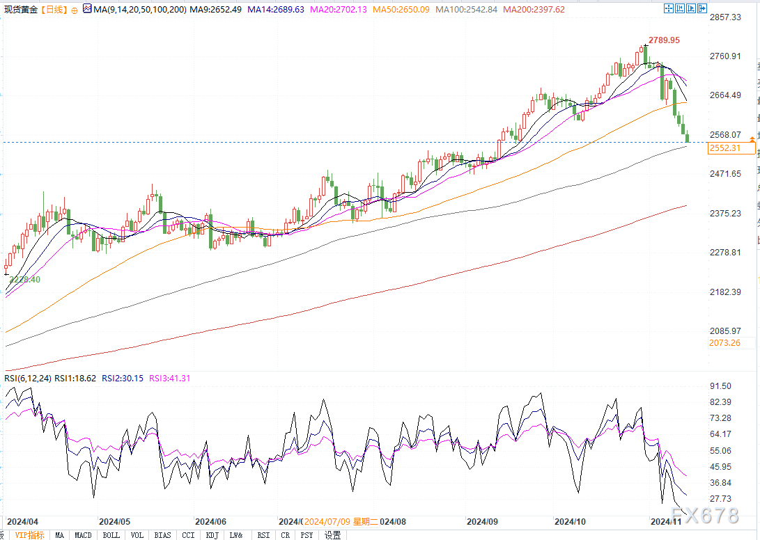 全球股市普遍上涨的基调也对黄金这种避险贵金属形成了额外压力,支持了黄金价格进一步下行的预期。交易员现正关注将于北京时间11月14日21:30发布的美国生产者价格指数(PPI)数据,以寻找短线机会。重点关注鲍威尔讲话,以获取未来降息路径的线索。从技术角度看,贵金属分析师Haresh Menghani认为,黄金价格跌破2600美元关口,被空头视为一个新的入场信号(同时也是6月至10月涨幅的38.2%斐波那契回撤位)。此外,日线图上的指标显示,黄金价格的下行趋势仍是主要趋势,金价可能跌向2542-2538美元区域。该区域包括100日均线和50%斐波那契回撤位,若跌破此处将进一步加大回调力度,且可能下探2500美元的心理关口。