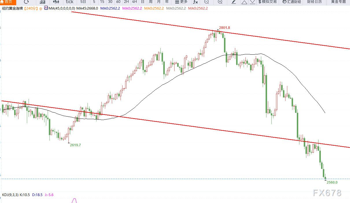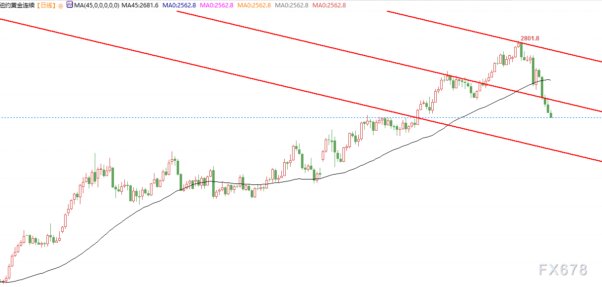 技术层面上来看,黄金日线级别跌破下跌通道中轴线,目前看,通道下沿来到2450美元附近,若短期再次反弹无法站稳2610美元,