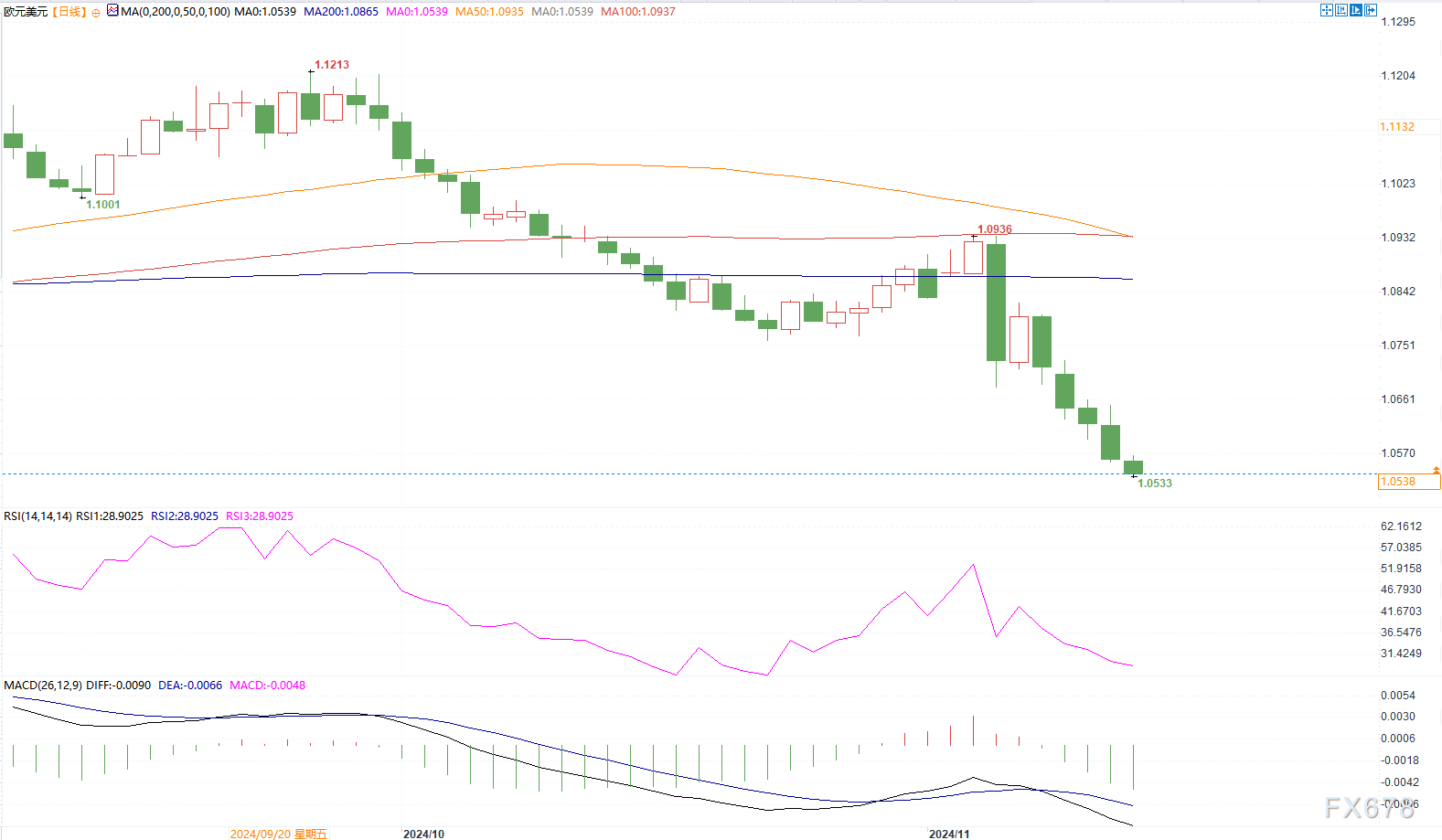 (欧元兑美元日线图,来源易汇通)北京时间11月14日,欧元兑美元报