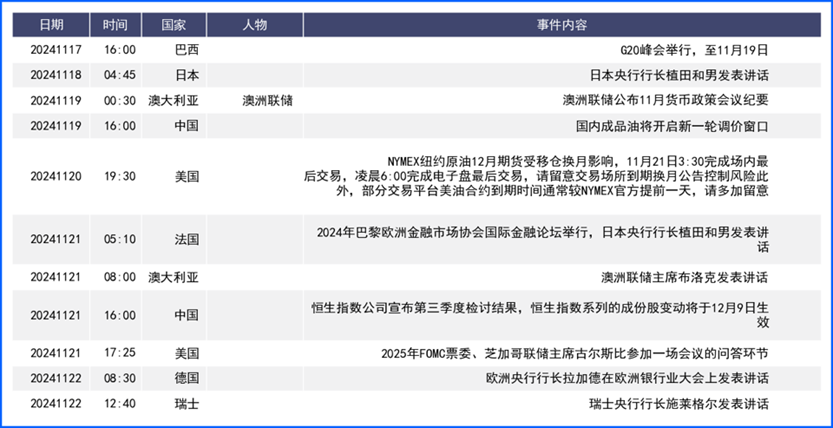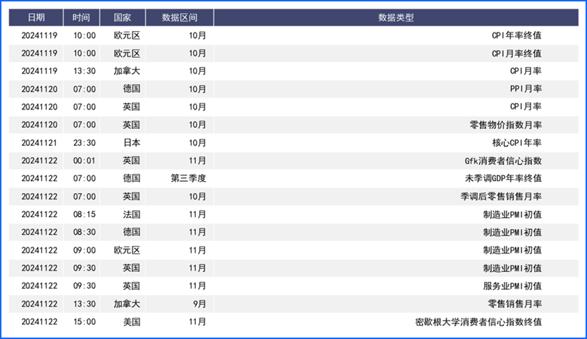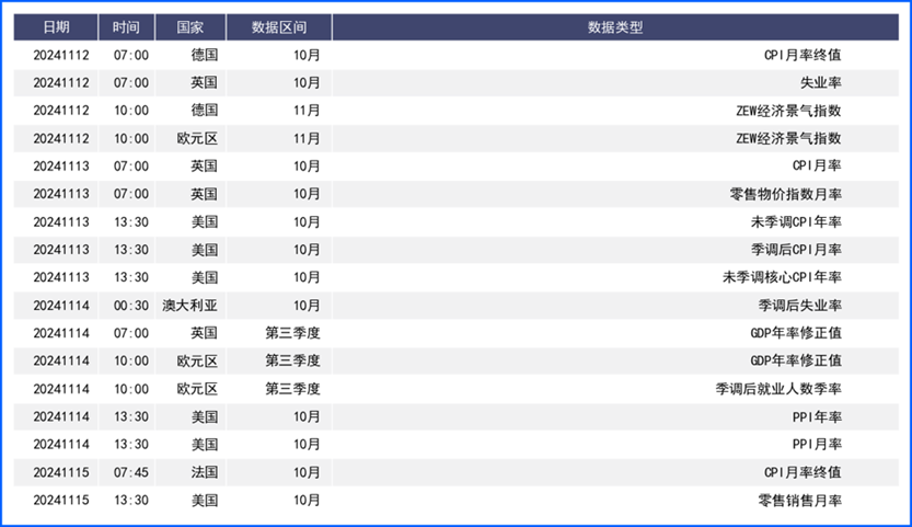 英镑兑美元上周下跌2.4%,创下2023年1月以来的最大单周跌幅。上周公布的英国9月经济数据表现萎缩,显示出第三季度经济增长进一步放缓,令市场放缓对英国经济复苏的预期。不过,特朗普上台后,由于英国是向美国提供服务的主要出口国,特朗普放松管制和减税对美国经济的提振可能有助于支撑英国的经济增长,但从数据表现看,英国基本面情况转好的迹象尚未出现。