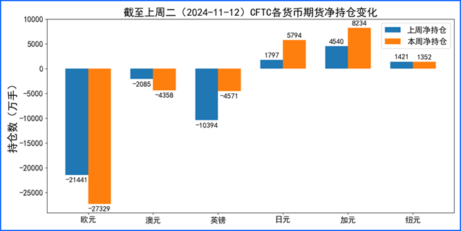 据美国商品期货委员会公布的2024-11-12期货市场头寸持仓报告显示,上周各货币的报告总持仓情况如下:欧元净空头变化5888手,澳元净空头变化2273手,英镑净多头变化5823手,日元净多头变化3997手,加元净多头变化3694手,纽元净空头变化69手,上周没有总持仓多空转换的货币。除此之外,单向总持仓变动超过20%的货币有:欧元,澳元,日元,加元。