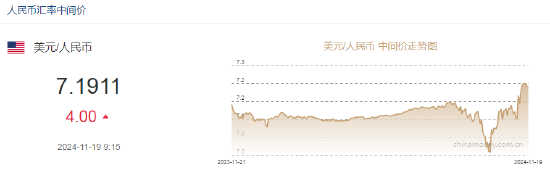 11月19日,人民币兑美元中间价报7.1911元,下调4个点。