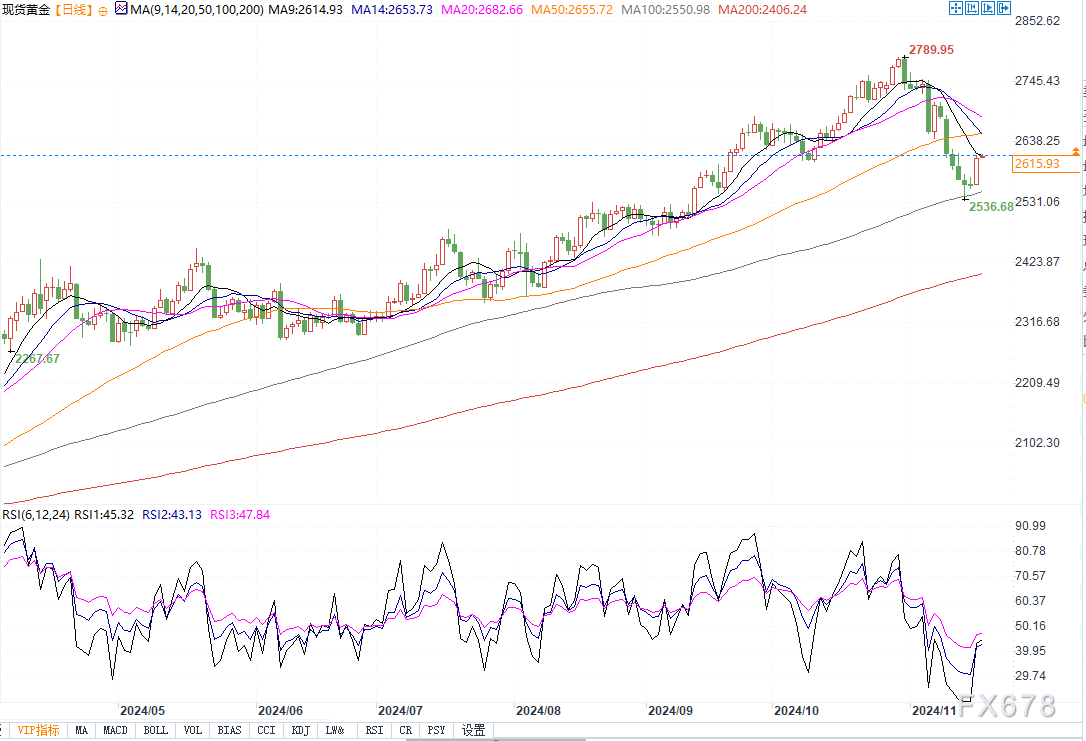现货黄金日线图北京时间11月19日9:10,现货黄金价格报2615.19美元/盎司