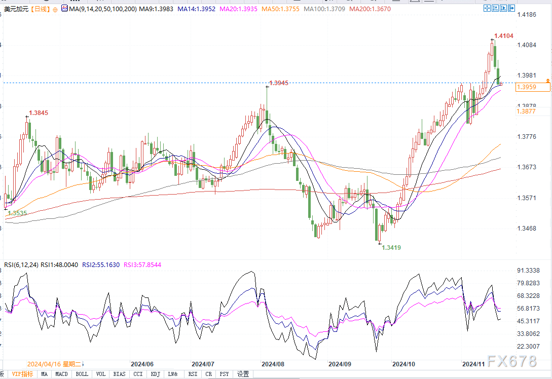 美元兑加元日线图北京时间11月20日10:40,美元兑加元报1.3959/61
