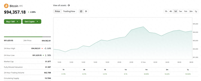 周三,比特币价格升至略低于95000美元的创纪录新高,向备受期待的10万美元里程碑迈近,因有报道称特朗普的社交媒体公司正在谈判收购加密交易公司Bakkt,这使得人们对特朗普政府执政下的加密行业前景更为乐观。