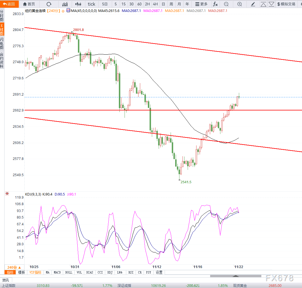 周五(11月22日)亚盘尾盘时段,COMEX黄金交投于2688美元附近,基本面上俄乌冲突引发的避险情绪继续升温。即使美元指数再创阶段新高也未能使得黄金走低,主要是日线级别存在修正需求,同时避险情绪加持之下,黄金维持多头运行。